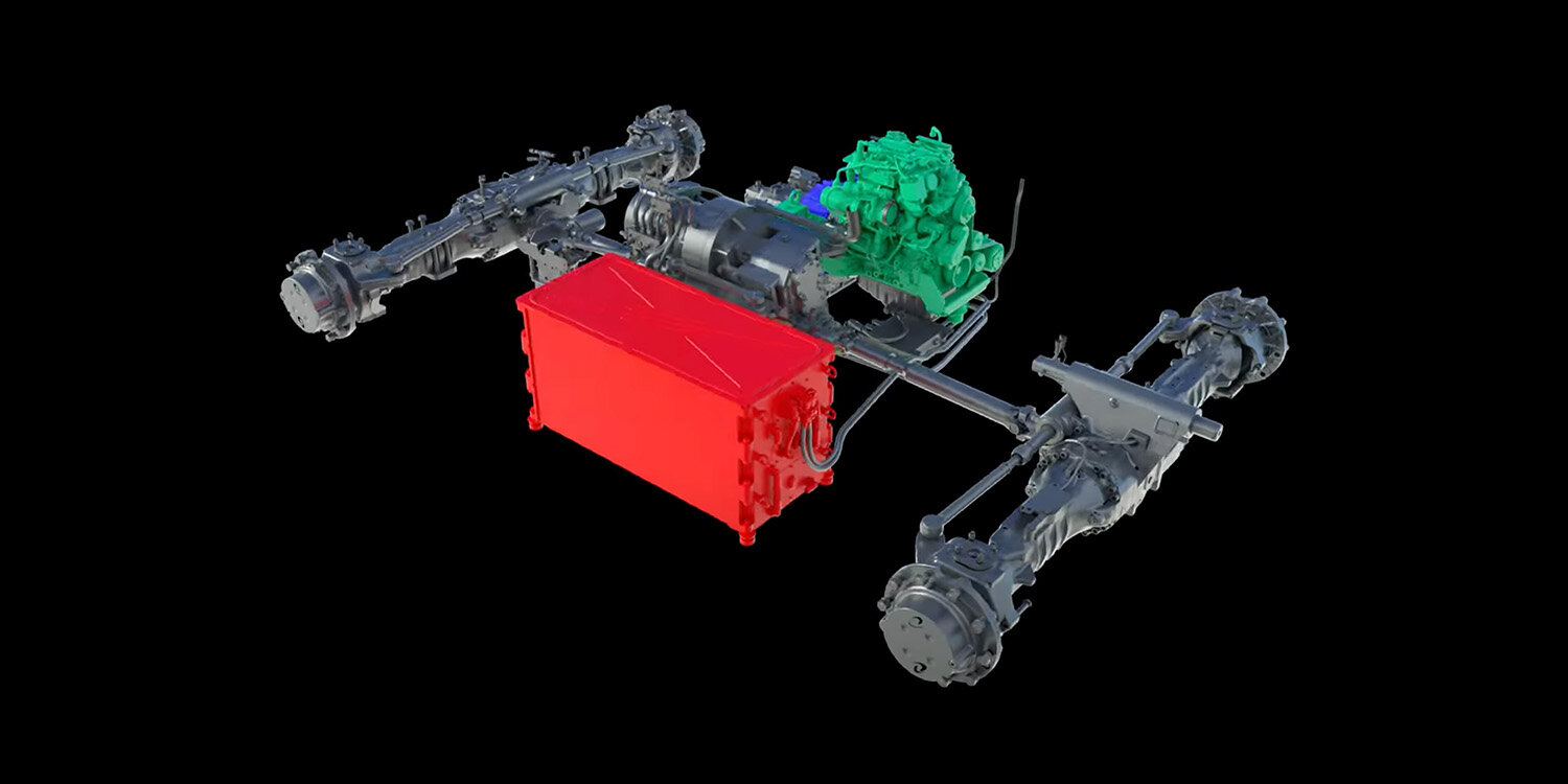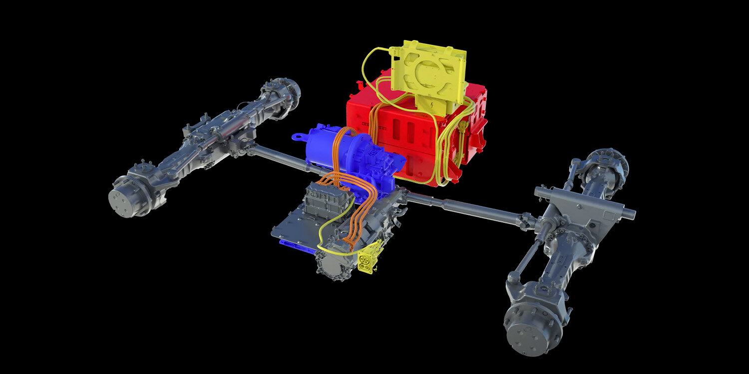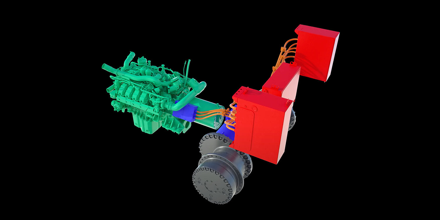 Pro Themeninsel gab es einen großen Touchscreen mit vertiefenden technischen Informationen, für die wir Bilder, Grafiken und Animationen kreierten. Dazu kamen physische Exponate wie z. B. ein Motor oder eine Brennstoffzelle. Als spektakulären Blickfang gestalteten wir zusätzlich eine 3D-Holo-Wall: eine Vitrine aus Plexiglas, in der drei unterschiedliche Antriebstechnologien als 3D-Hologramme projiziert wurden: ein batterieelektrischer und ein hybridelektrischer Abtrieb für einen Teleskoplader sowie ein dieselelektrischer Antrieb für eine Planierraupe. Die futuristische Anmutung der Hologramme passte dabei perfekt zu den zukunftsweisenden Antriebslösungen von Liebherr.
